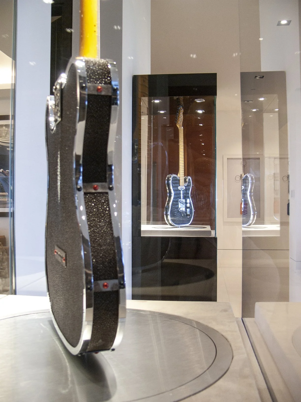 7’ 6” H x 2’ 0” W Guitar display cases with custom rotating turntable.